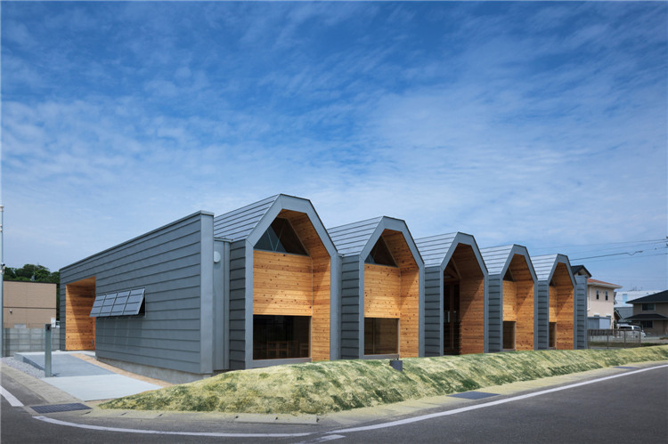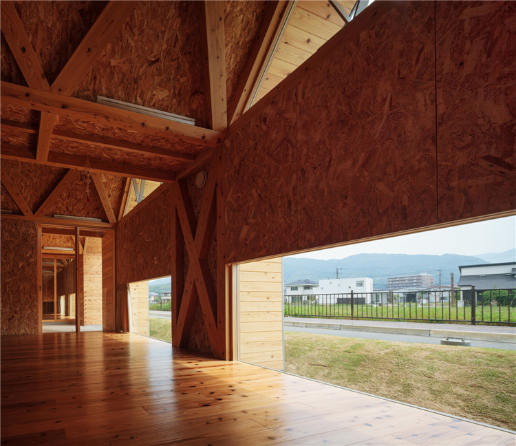 本案托兒所位于福岡市附近的太宰府市,為了容納更多的孩子,不得不增加為兩個(gè)班級??紤]到日本全國范圍的出生率下降,不久的將來這里的孩子數(shù)量可能會(huì)減少,因此建筑師決定建造一座只有一室空間(9米跨度)的建筑,內(nèi)部沒有支柱,方便各種用途(游戲室等)的轉(zhuǎn)換。木桁架梁在工廠安裝,用拖車運(yùn)送到施工現(xiàn)場。復(fù)雜的連接也是在工廠制作的,只有一個(gè)相對容易的連接在現(xiàn)場組裝。這樣的方式提高了施工精度,縮短了施工工期。