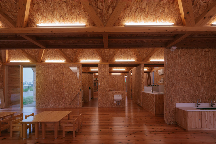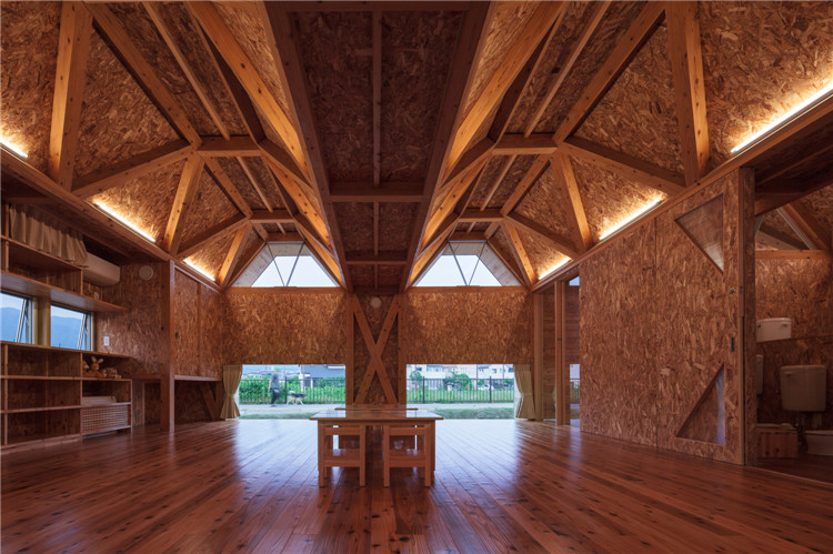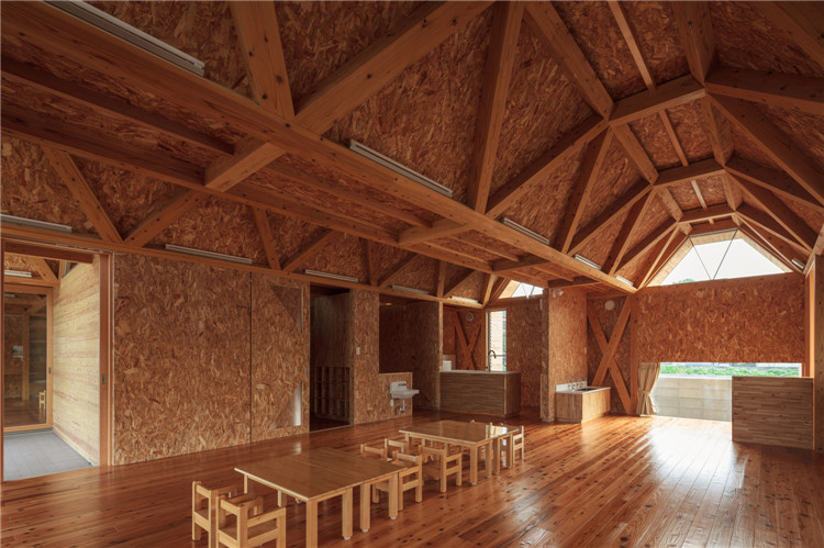 屋頂結(jié)構(gòu)采用折疊板設(shè)計(jì),無柱空間是通過運(yùn)用木桁架梁屋頂結(jié)構(gòu)實(shí)現(xiàn)的,形狀像一塊折疊板。所有支撐屋頂結(jié)構(gòu)的承重墻都被布置在建筑外圍。現(xiàn)在這座建筑分成了兩個(gè)保育室、衛(wèi)生間等,但將來也可以轉(zhuǎn)換為一個(gè)大房間。