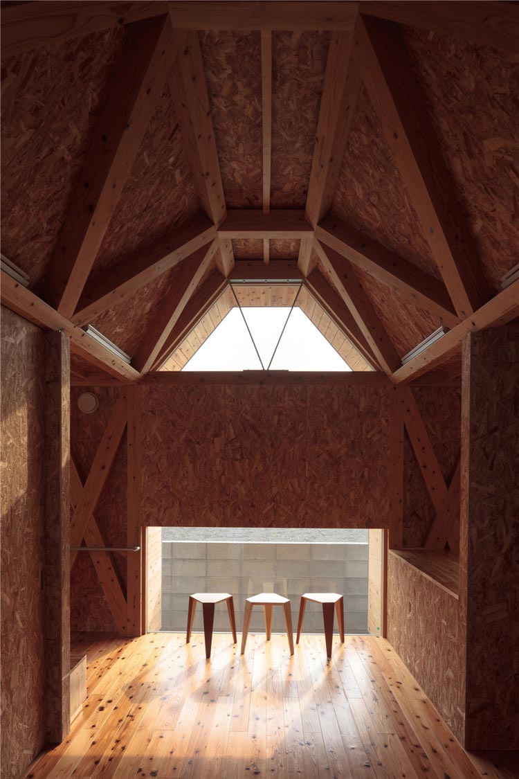 建筑的所有結(jié)構(gòu)不是天花板就是墻體,木桁架梁傾斜設(shè)置,是屋頂?shù)幕A(chǔ)結(jié)構(gòu)木構(gòu)件。這樣的設(shè)計(jì)滿足了客戶對于“保育室被木頭包圍”的要求,減少了建設(shè)成本。此外,通過降低天花板的高度,木材長度被縮短了,對空調(diào)的需求也降低了。由于天花板幾何形狀不規(guī)則且窗戶為梯形,因此雖然天花板最低的地方只有2.2m左右,但即使是成年人也不會(huì)感到壓抑。