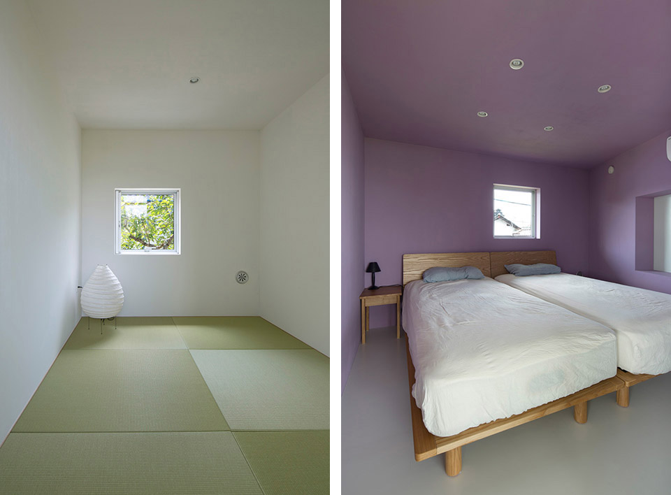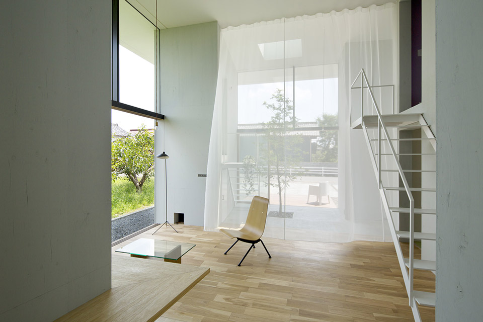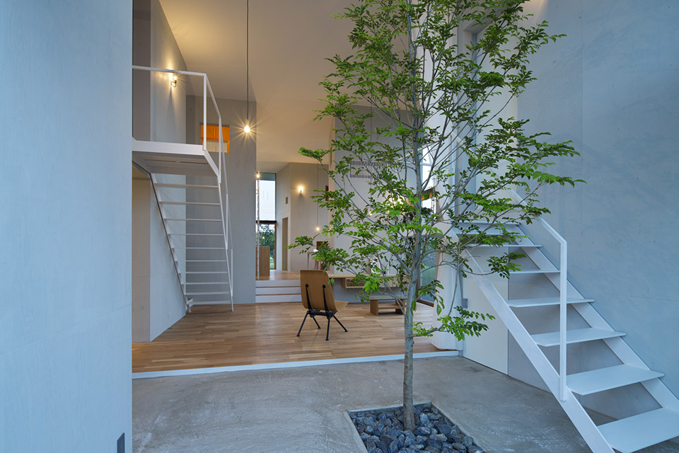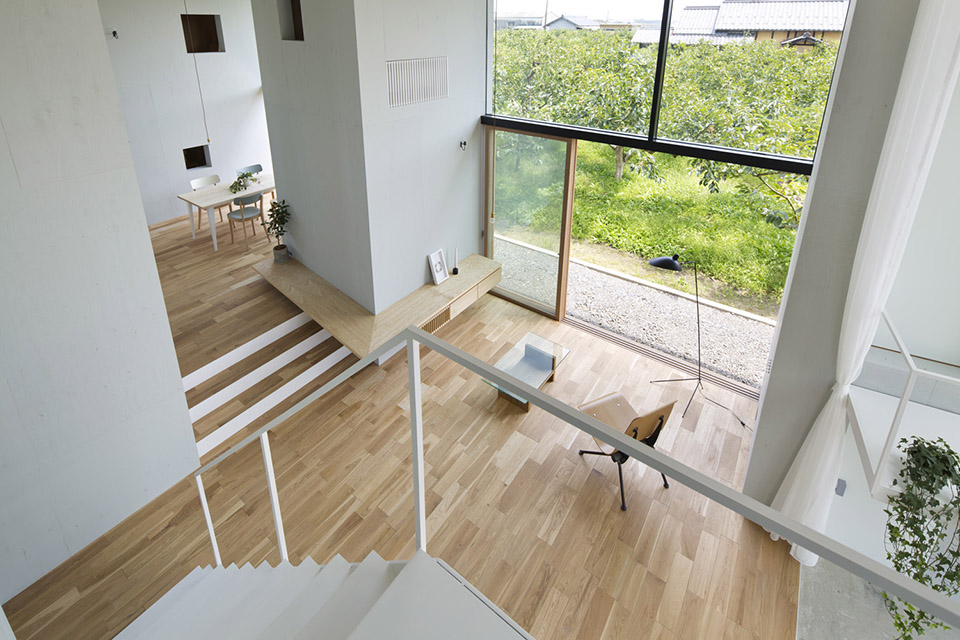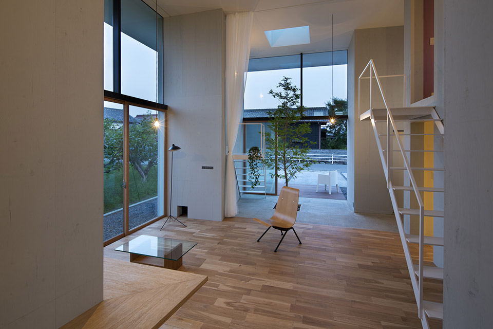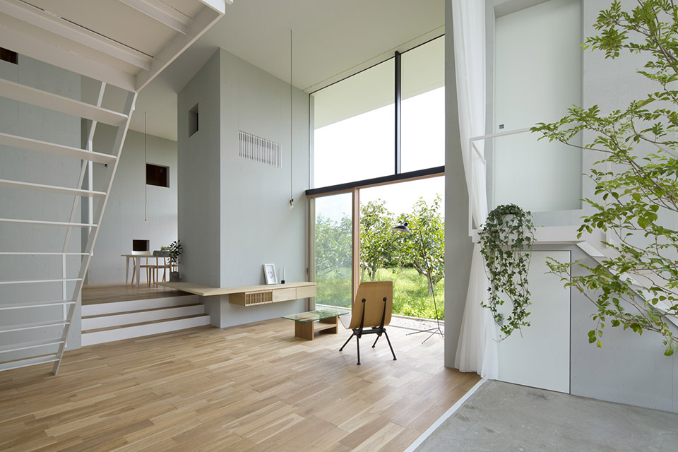 對自然開放,并受到果樹圍繞的室內公共空間讓人感到開闊而放松。公共空間的室內高度有兩層層高的尺度,為了利用結構體的上層空間,每個都有專用樓梯到達上層,其中四個樓梯放置在公共空間中,還有三個爬梯分別放置在相對應的結構體自身中。
