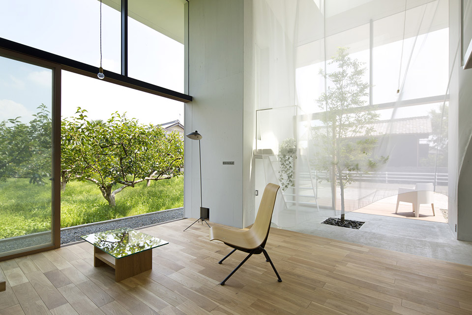 果園內的樹木成為了住宅的天然隱私屏障與自然風景。身處其間的住宅構架開放,可以簡單理解為7個結構體支撐起一個巨大的屋頂,這七個結構體有相當?shù)暮穸?,所有的私人空間比如衛(wèi)生間和臥室都位于其中,而7個結構體之間,屋頂下方的自由空間,是住宅的公共空間—客廳,餐廳,廚房。