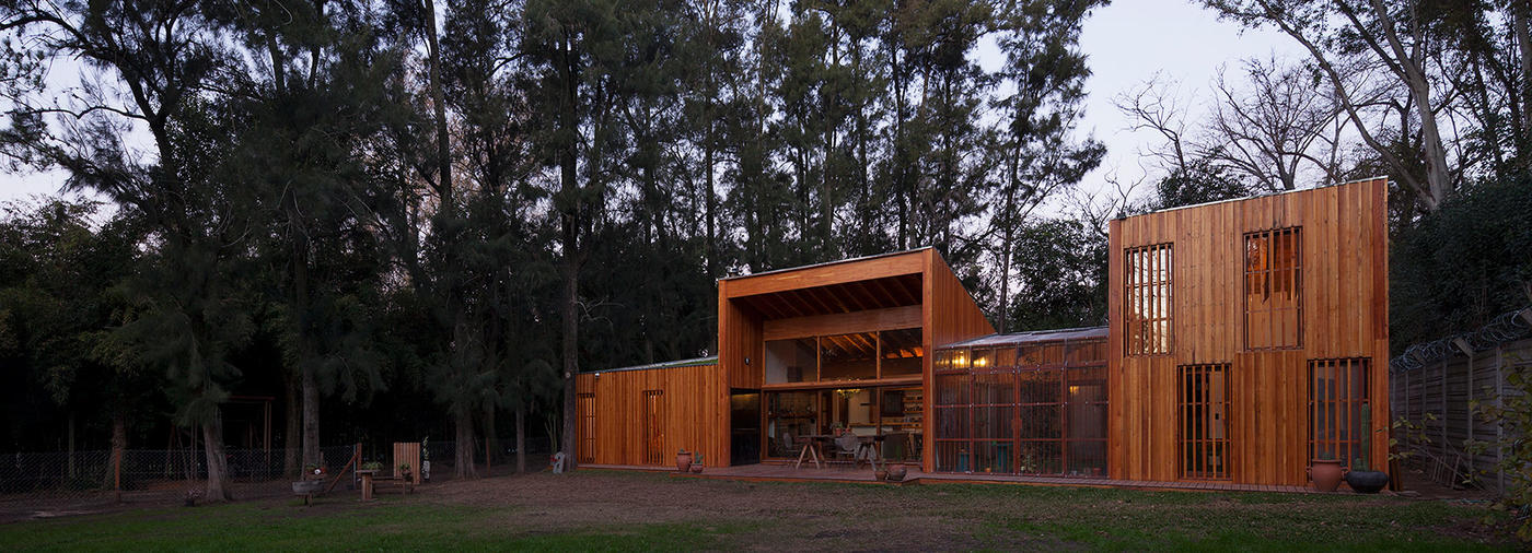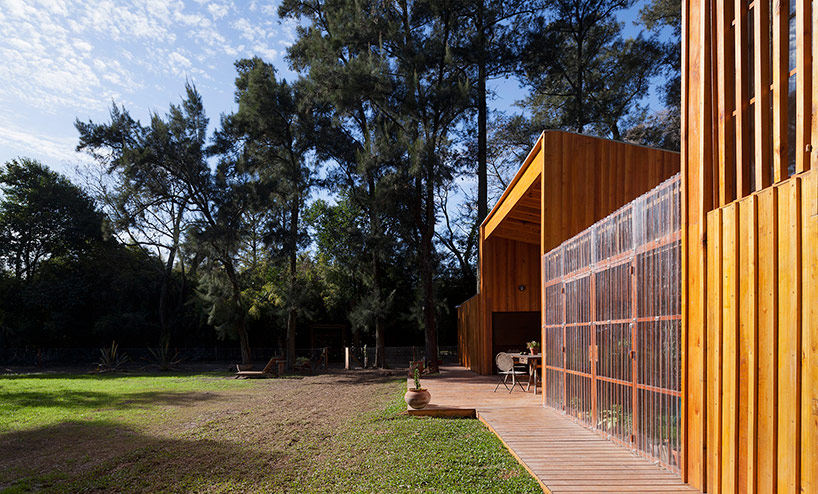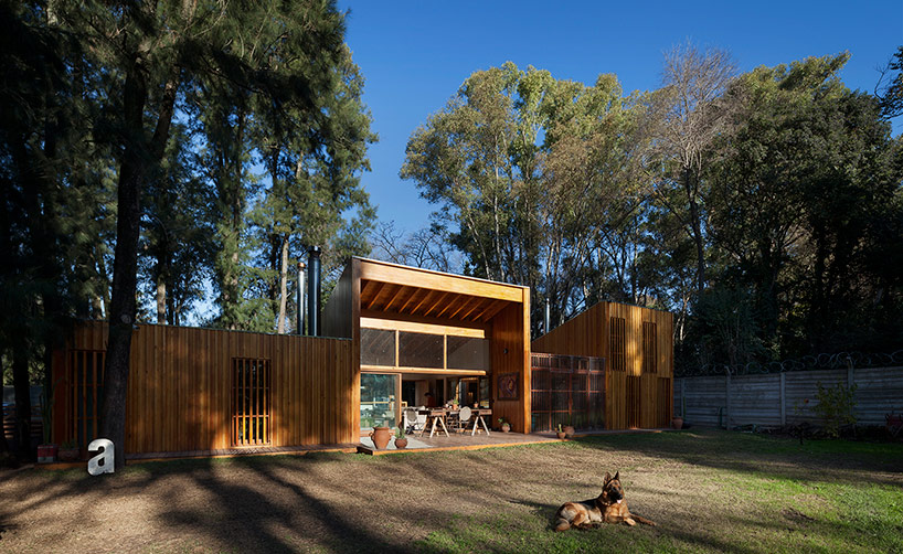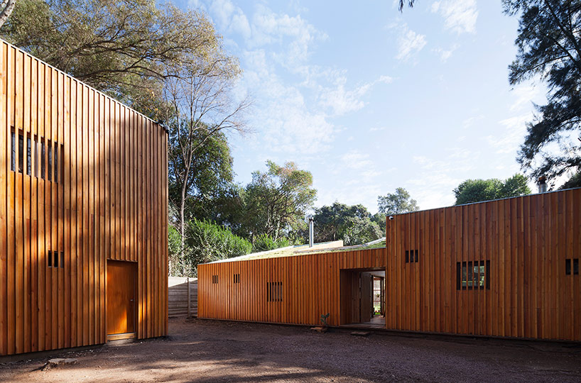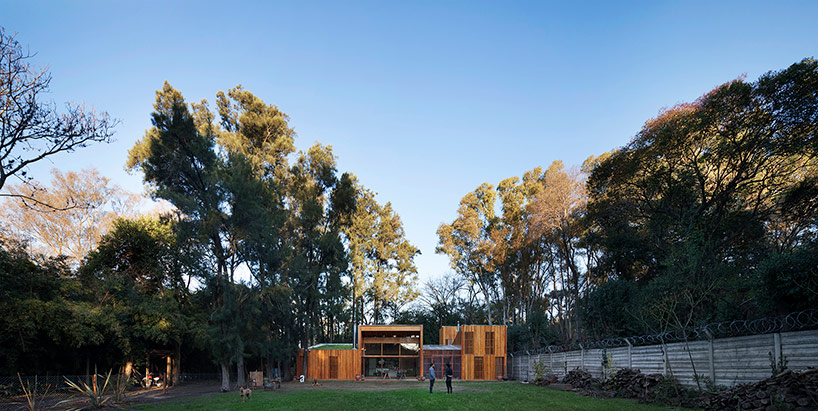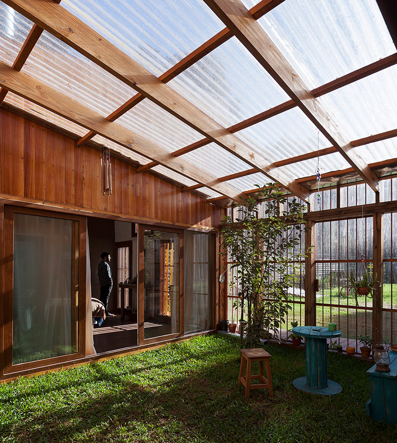 阿根廷建筑事務(wù)所IR arquitectura與我們分享的項(xiàng)目,是位于阿根廷布宜諾斯艾利斯(Buenos Aires)郊外托爾圖吉塔斯市(Tortuguitas)的 Casa Aa節(jié)能住宅。在這個(gè)養(yǎng)育著孩子的家庭住宅,家里明確地劃分出大人與小孩間的分隔,同時(shí)又融入樹木茂盛的場(chǎng)地環(huán)境中,擁有進(jìn)行室外活動(dòng)的空間和充沛的陽光。波浪狀聚碳酸酯屋頂覆蓋下的半室外綠色庭院是個(gè)溫室和有頂花園空間,并與位于中心位置的矩形起居空間相鄰。共享的起居區(qū)和主臥擁有朝北最高的洞口,使能照射到的陽光最大化,而建筑的外部形態(tài)因此被分割成四部分。上下交替的傾斜綠色屋頂提供了一個(gè)很好的天然熱絕緣體,還有助于替換建筑所占據(jù)的自然地被。