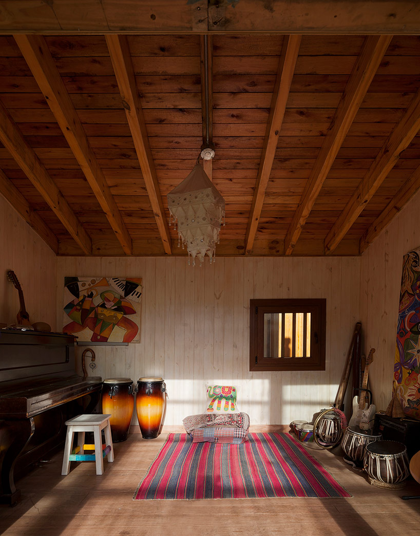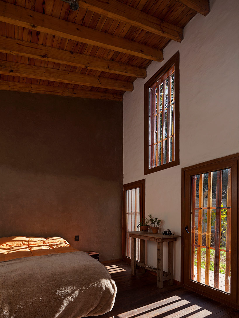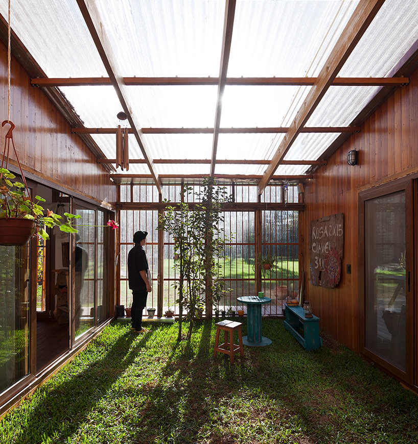 主臥的傾斜屋頂朝庭院呈開放狀。