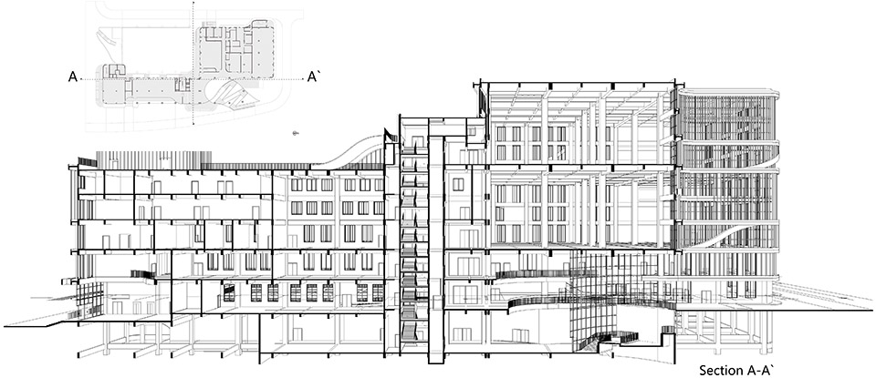 我們希望通過這個項目喚起我們的父輩及下一代的歸宿感。農(nóng)業(yè)生產(chǎn)是那個時代“集體式生活”的標(biāo)志,自然地貌便是這一代人集體記憶的背景。我們通過對建筑空間在“地面”層面上的疊加,再現(xiàn)了自然地貌:在城市層面上,由于本項目地處城市擴(kuò)張的邊界,位于較低的洼地地形,面鄰一個保留的綠化高地,我們在建筑手法上引入一系列上下錯開的水平樓板來使這兩種極端的地貌形成空間上的對話;在建筑尺度,我們轉(zhuǎn)譯了這種拓?fù)潢P(guān)系為一種多層樓板的空間類型,例如地下室空間轉(zhuǎn)折到首層入口層,接著又垂直延伸到二層空間,并不斷交錯向上;在細(xì)部層面,我們使用了木紋鋁方通遮陽板系統(tǒng)將豐富的地景引入到室內(nèi),是對本土的竹材結(jié)構(gòu)建筑形制所做出的回應(yīng)。