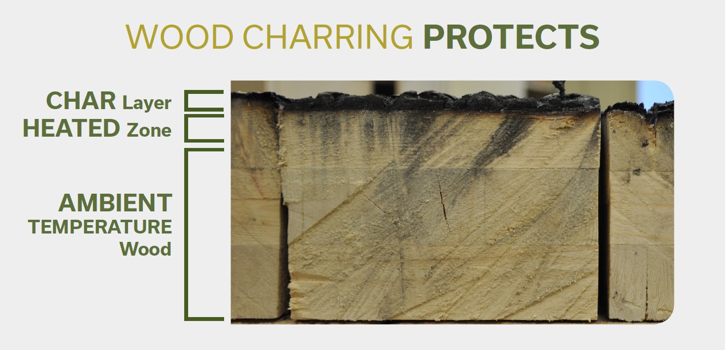 大塊木材通過內(nèi)層的隔熱層而具有耐火性。當(dāng)木材暴露于火中時(shí),暴露的表面會(huì)燃燒,從而形成自然的碳化保護(hù)層。炭化層作為隔離層,延遲了下層木芯的加熱。由于大塊木材是由實(shí)心的部件組成,空氣和火勢蔓延被抑制了。炭以可預(yù)測的速率(約3.81厘米每小時(shí))形成,以減慢燃燒和火勢蔓延。