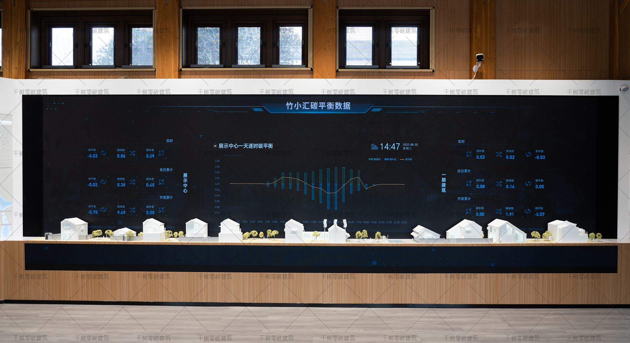 報告廳木屋和展示中心木屋墻面采用隔氣膜+內(nèi)外雙層保溫(內(nèi)保溫184mm厚,外保溫70mm厚)+CLT正交膠合木飾面板,屋面采用隔氣膜+保溫(屋面保溫235mm厚)+光伏瓦的圍護結(jié)構(gòu),門窗采用被動式節(jié)能阻燃木門窗(內(nèi)置遮陽百葉),加上高能效的技術(shù)設備:地源熱泵系統(tǒng)、風力發(fā)電系統(tǒng)、建筑光伏一體化系統(tǒng)、光儲直柔系統(tǒng)、熱回收系統(tǒng),通過可視化的智慧運維管理平臺高效監(jiān)管、智慧運算,綜合管控與整治,最終實現(xiàn)了零碳建筑的目標。