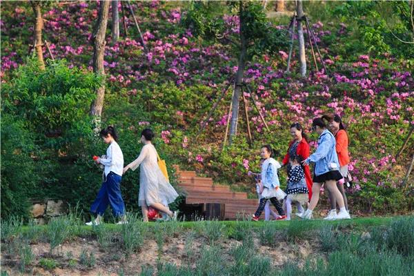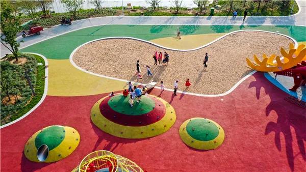 與花海兩兩相望的親子樂(lè)園,孩子們的歡笑聲隨著秋千飄到天上,推秋千的大人難掩笑意,人與人之間變得柔軟。