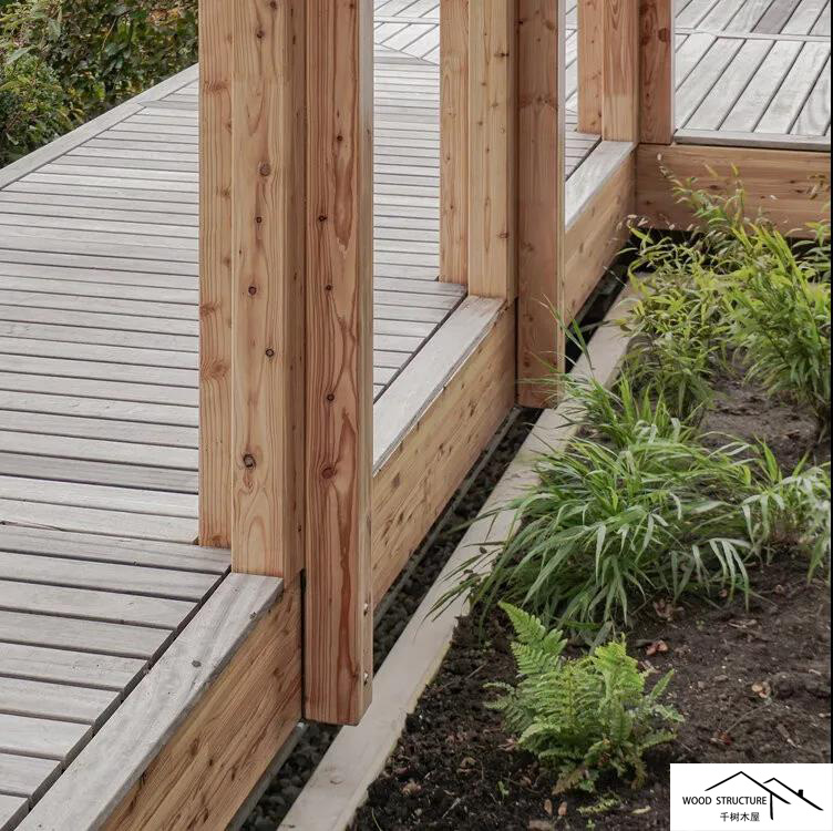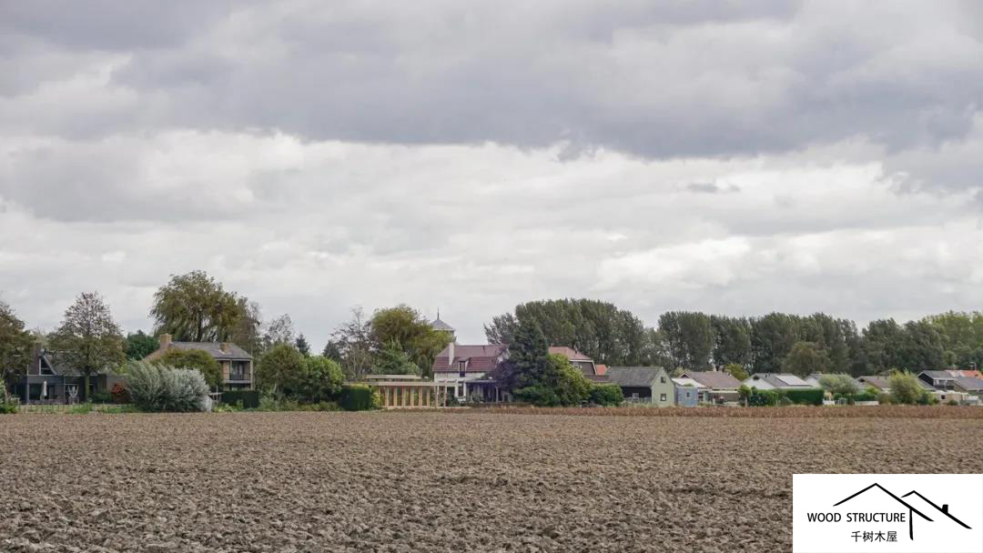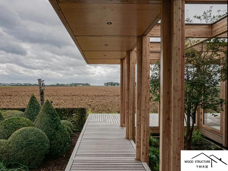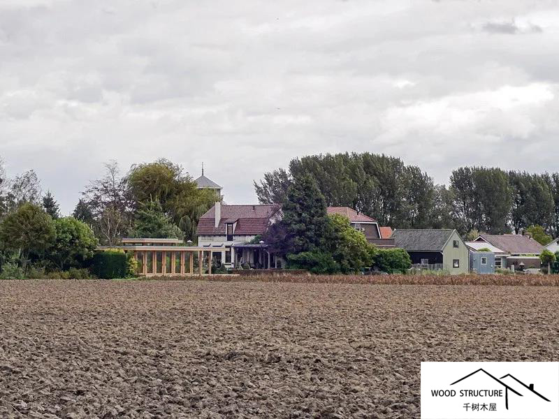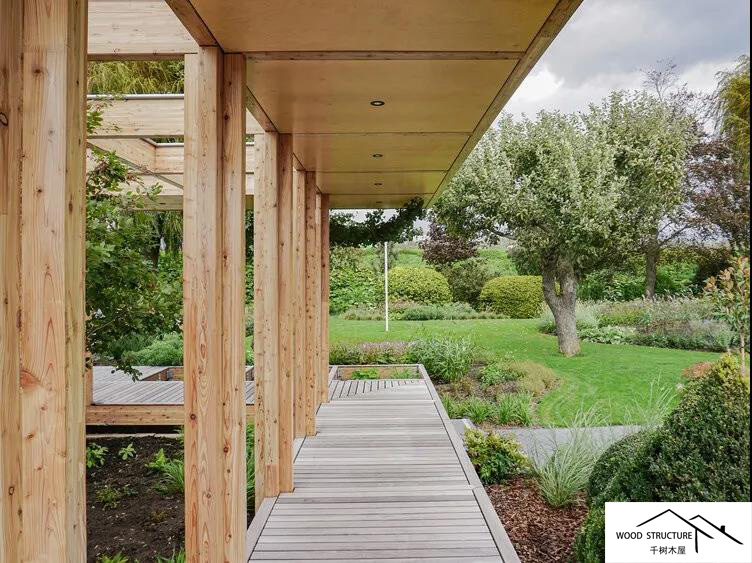 露臺甲板橋面懸挑在一條現(xiàn)有的溝渠上,這條溝渠創(chuàng)造了花園和農(nóng)田之間的邊界。從這個(gè)有利的位置可以觀察到不斷變化的農(nóng)田。涼棚與建筑結(jié)合在一起,從內(nèi)部與花園建立了非常直接的關(guān)系。大部分雨水通過屋頂引導(dǎo)到?jīng)雠?,灌溉植物和樹木。這個(gè)模塊化結(jié)構(gòu)采用落葉松層壓膠合板與CLT組合而成。