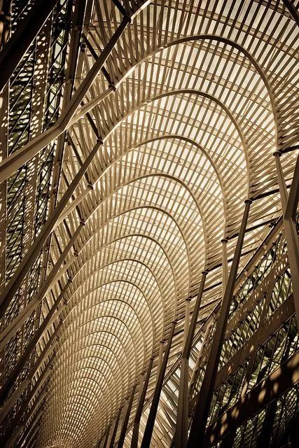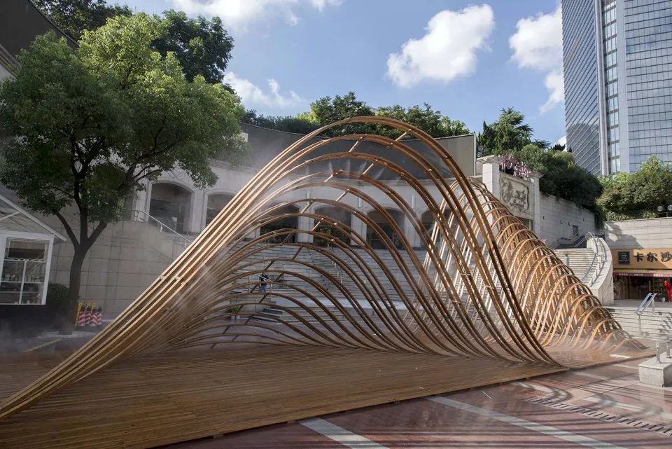 為了達(dá)到更輕薄的形體效果,建筑主體采用竹鋼搭建,豎向的立柱每根都為承重住,從而達(dá)到均勻受力的效果。“柱”與“梁”的連接部分采用簡單的交錯(cuò)堆疊起來進(jìn)行構(gòu)造的方法,使其在形式上產(chǎn)生出類似斗拱結(jié)構(gòu)的效果。
