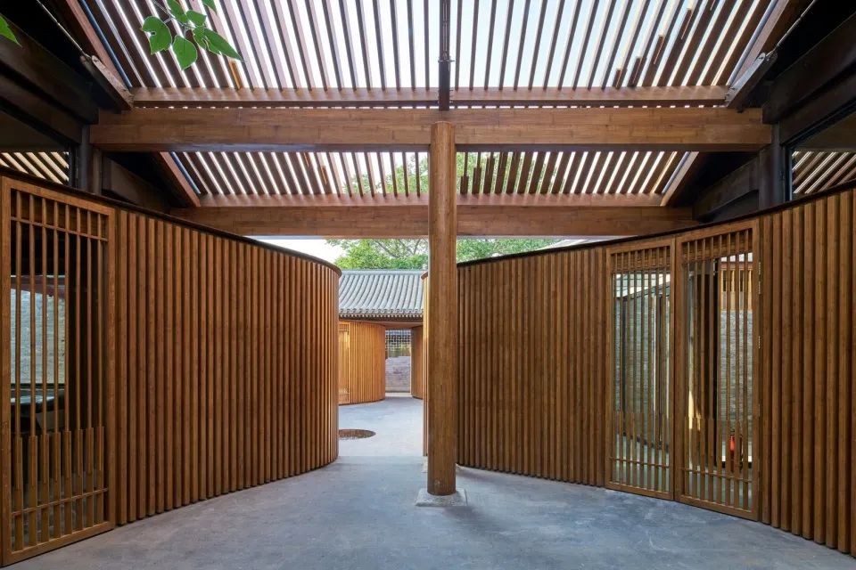 屋頂用原先木架尺寸的竹鋼梁架搭接,椽子采用十字交叉竹鋼構(gòu)件組合,在小院的正上方勾勒出葫蘆形的輪廓,通透的竹鋼板屋面一方面呼應(yīng)了原有屋瓦的尺度,又形成屋面中間更為通透的效果,給屋中小院引入充足的陽光,便于樹木生長。
