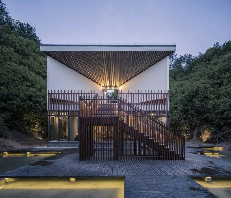 曲面屋頂聯(lián)系起整個(gè)建筑群落,豎向的桿件結(jié)合曲面屋面,組成自由、輕盈的建筑形態(tài),取材延續(xù)中國古建筑的質(zhì)樸自然,借助青瓦、鋼木等,打造建筑的原始與本真,釋放出閑適愜意的空間氛圍。