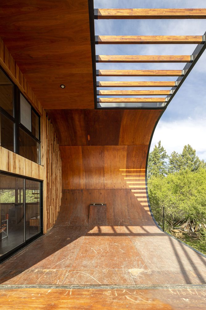 這是一個(gè)100%可持續(xù)的住宅,同時(shí)業(yè)主也可以在上面滑滑板。業(yè)主是一名滑板者,希望房子本身附帶一個(gè)滑板場(chǎng)地。設(shè)計(jì)師將室外陽(yáng)臺(tái)設(shè)計(jì)成滑道,并在向南一側(cè)設(shè)置一面墻,在住宅東南角形成一個(gè)向上的弧形用于減速。這面墻延伸到了屋檐處,起到阻擋夏天烈日的作用。